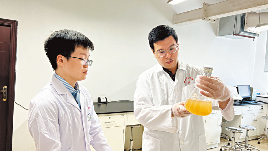 ●西南大學尚峰副教授(右)和學生正在實驗室觀察培養皿。香港文匯報記者孟冰