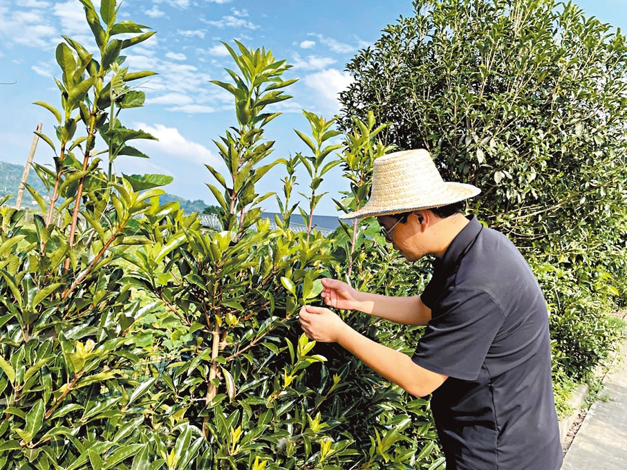 ●炎炎夏日,尚峰來到田間觀察植物葉片上的蟲害。 香港文匯報重慶傳真