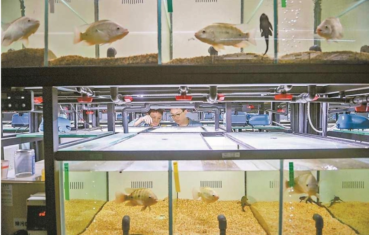 10月24日,西部(重庆)科学城种质创制大科学中心,罗非鱼创制团队科研人员正在室内繁殖系统实验室进行研究工作。