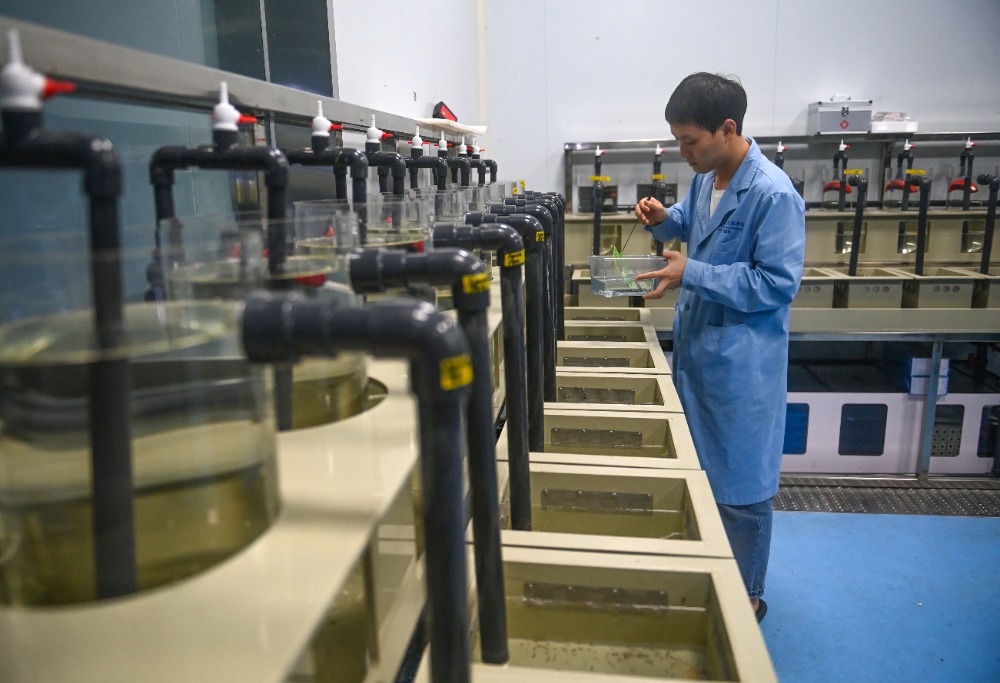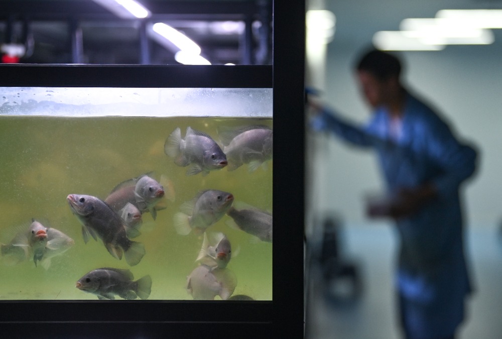 ▲10月24日,西部(重庆)科学城种质创制大科学中心,罗非鱼创制团队科研人员正在室内繁殖系统实验室进行研究工作。记者 郑宇 实习生 巨文俊 摄