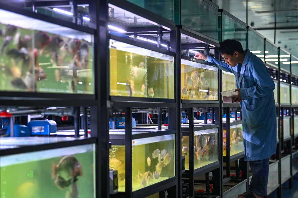 ▲10月24日,西部(重庆)科学城种质创制大科学中心,罗非鱼创制团队科研人员正在投喂饲料。记者 郑宇 实习生 巨文俊 摄