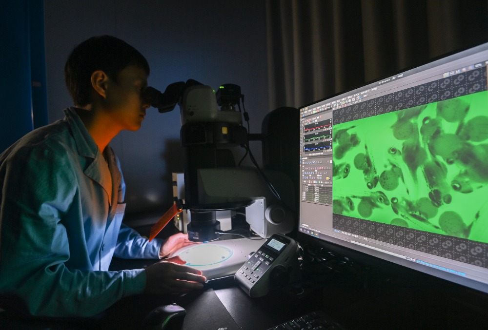 ▲10月24日,西部(重庆)科学城种质创制大科学中心,罗非鱼创制团队科研人员正在通过显微镜观察记录鱼苗发育情况。记者 郑宇 实习生 巨文俊 摄