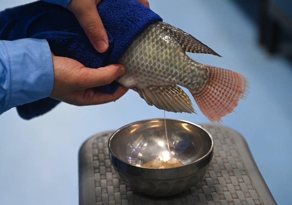 ▲10月24日,西部(重庆)科学城种质创制大科学中心,罗非鱼创制团队科研人员正对罗非鱼进行人工授精。记者 郑宇 实习生 巨文俊 摄