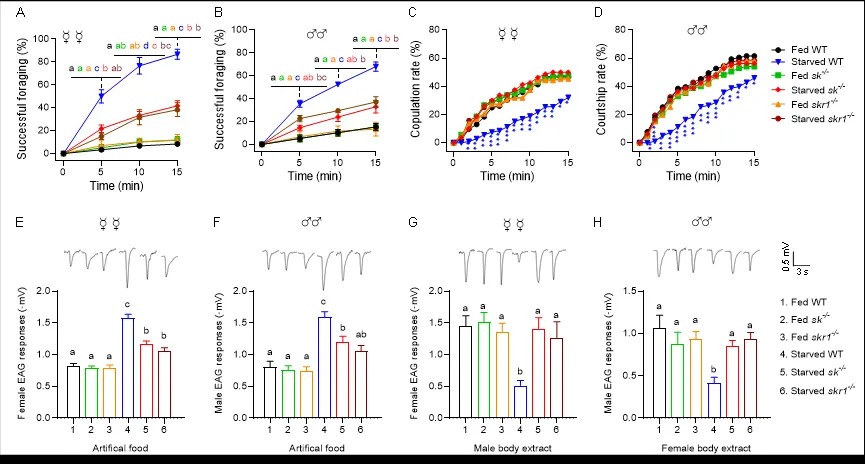 为了明确觅食和交配行为转换的调控因子,研究团队比较了饱腹和饥饿橘小实蝇触角中神经肽信号的表达谱,结果发现Sulfakinin神经肽信号系统在饥饿试虫触角中上调倍数最大。采用基因剪辑技术敲除神经肽Sulfakinin或受体SkR1后,饥饿处理突变体12小时既不能增强觅食行为,也无法抑制交配行为。这表明,Sk-SkR1信号系统促进觅食的同时抑制交配,是饥饿诱导橘小实蝇从交配行为转换至觅食行为所必需的。