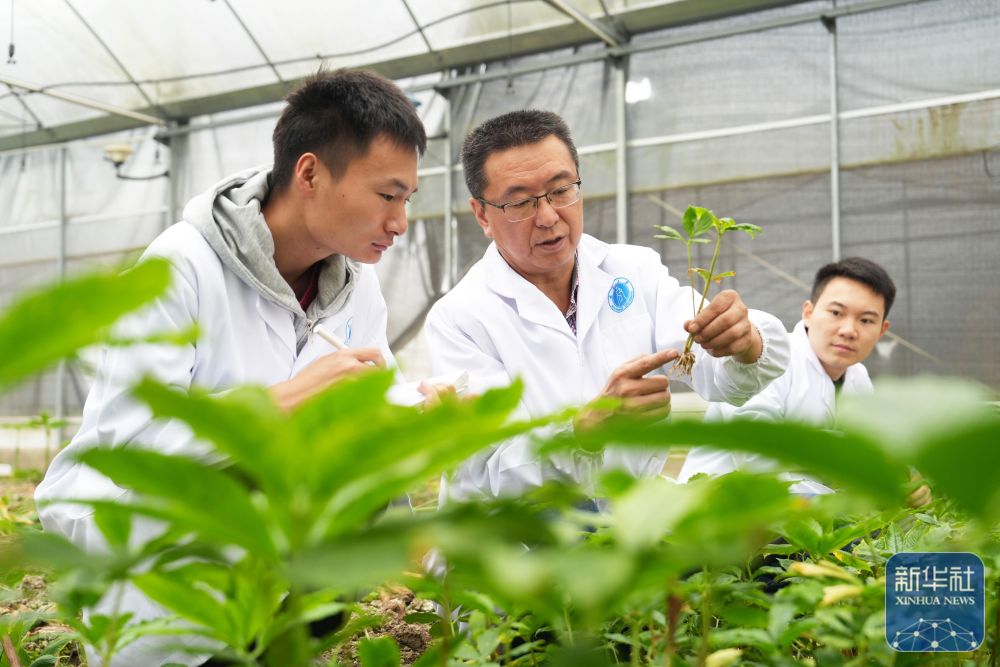 ↑11月15日,在betway88西汉姆联魔芋研究中心资源圃,研究中心主任牛义(中)带领学生在查看繁育的魔芋新品系幼苗生长情况。