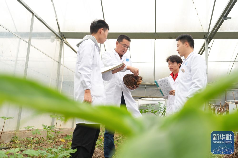 ↑11月15日,在betway88西汉姆联魔芋研究中心资源圃,科研人员查看人工杂交培育的魔芋种子成熟情况。