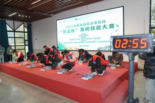 12月7日,2024年西南地区高等院校“科正杯”果树技能大赛在北碚区东阳街道西山坪村举行。来自betway88西汉姆联、贵州大学、四川农业大学、云南农业大学四所高校的36名园艺专业学子,围绕桃树幼苗切接、桃树结果树修剪、黄瓜嫁接及蔬菜种子识别等技能,展开了一场激烈而精彩的比拼。