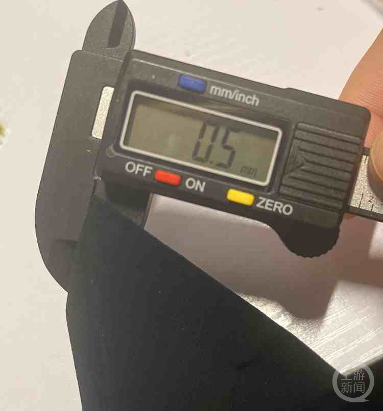 上游新闻记者专程找来某公司生产的“蛋膜衣”体验。通过游标卡尺测量,该“蛋膜衣”面料单层厚度0.25毫米,一件普通薄T恤厚度在1毫米,其重量为57.5克,确实非常轻薄。