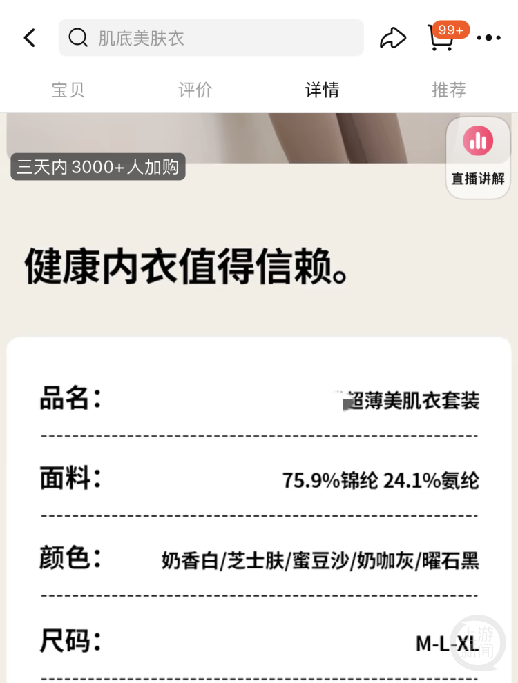 记者在某购物平台上搜索了“美肤衣”“蛋膜衣”,发现面料大多以锦纶和氨纶混纺为主。网络截图