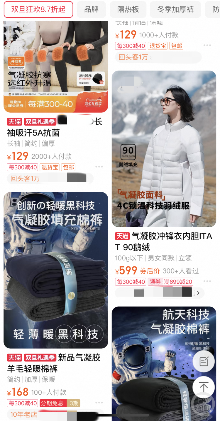 气凝胶面料保暖服装,包括气凝胶内衣、气凝胶羽绒服、抗寒服在今年也颇受追捧,商家宣传“气凝胶来自航天科技”,“恒温透气”“保暖与保身材”。气凝胶内衣售价一般价格在100多元,贵的气凝胶羽绒服售价则近千元。