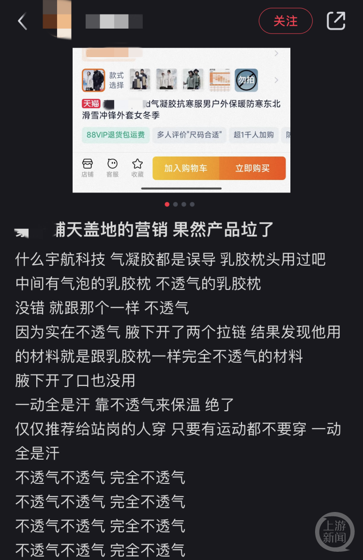 某网络社交平台上,有消费者反映气凝胶不透气。网络截图