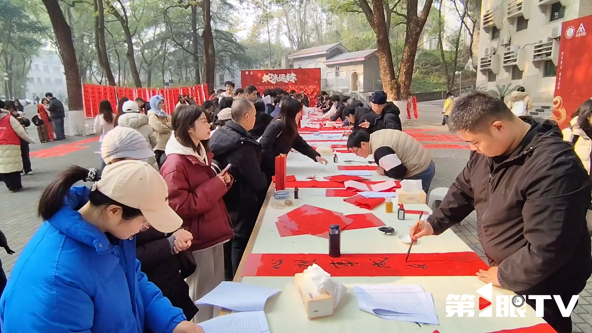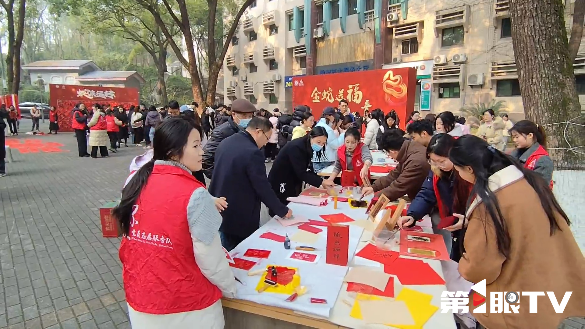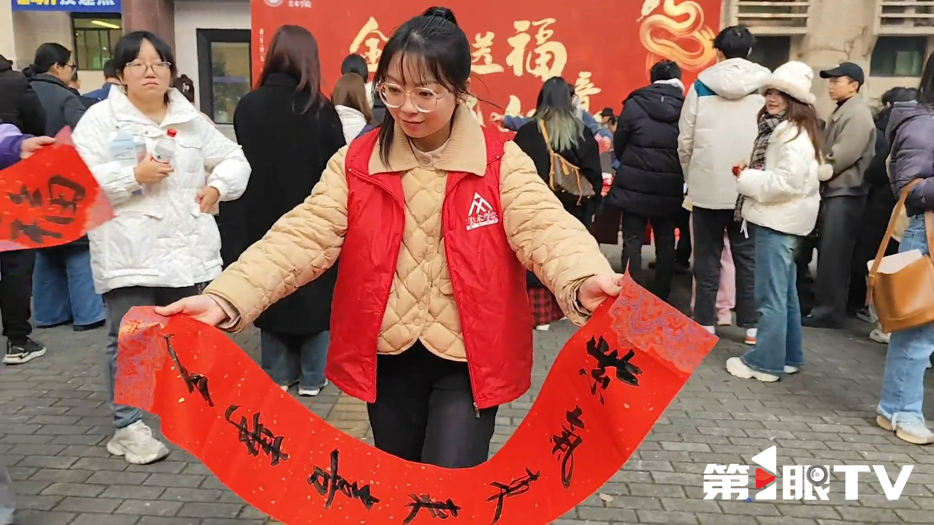 活动现场人声鼎沸,师生们在春联书写区大排长龙,等待着“定制”一份蛇年专属春联;百福墙前,同学们纷纷手持自己的“心头好”,定格幸福瞬间。