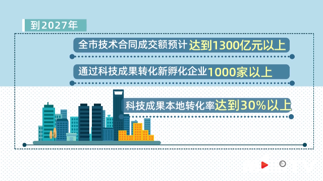 市科技局介绍,2024年我市升级建设环大学创新创业生态圈10个,实现科技成果转化超1700项,是上一年度的4倍。到2027年,全市技术合同成交额预计达到1300亿元以上,通过科技成果转化新孵化企业1000家以上,科技成果本地转化率达到30%以上。