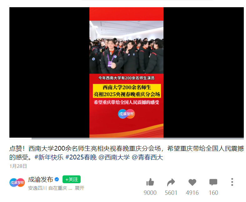 发布时间: 2025-02-28 16:43 文字:视频号 编辑:韩笑 来源:成渝发布 初审:魏琴 浏览次数: