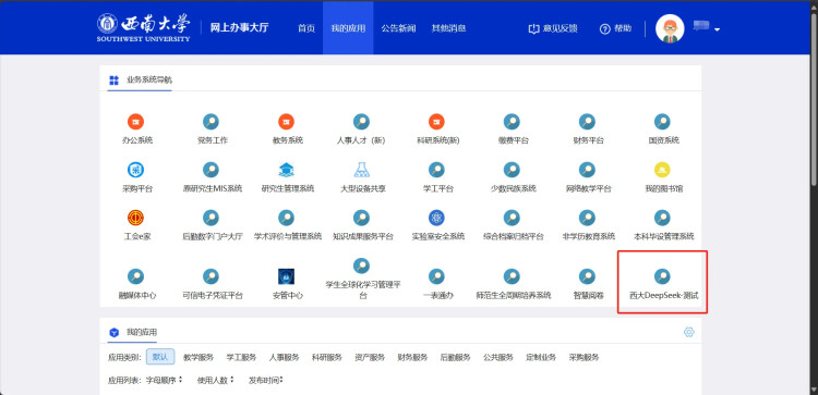 广大师生只需登入“数智西大”客户端或网上办事大厅,便能即刻上手体验西大专属DeepSeek。在教学方面,教师可借助DeepSeek设计更具针对性和趣味性的教学方案,提升课堂效果;在科研方面,研究人员可利用其强大的数据分析和知识挖掘能力,加速学术研究进程;在管理方面,DeepSeek将助力校园办公自动化,提升管理效率。