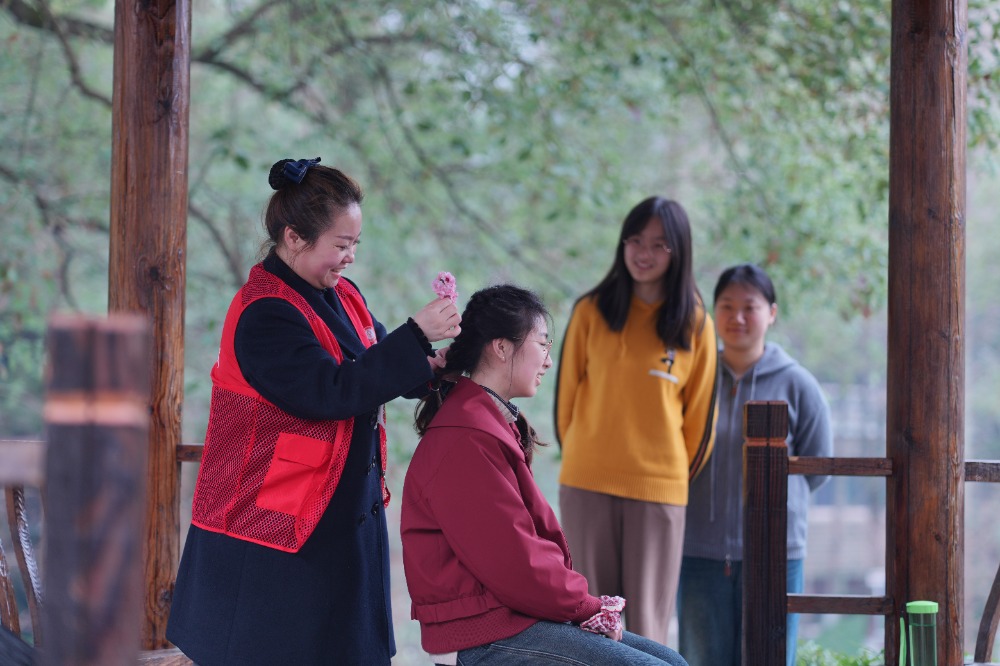 ▲2025年3月1日,betway88西汉姆联,志愿者们正在给大学生“扎龙辫”。特约摄影 秦廷富