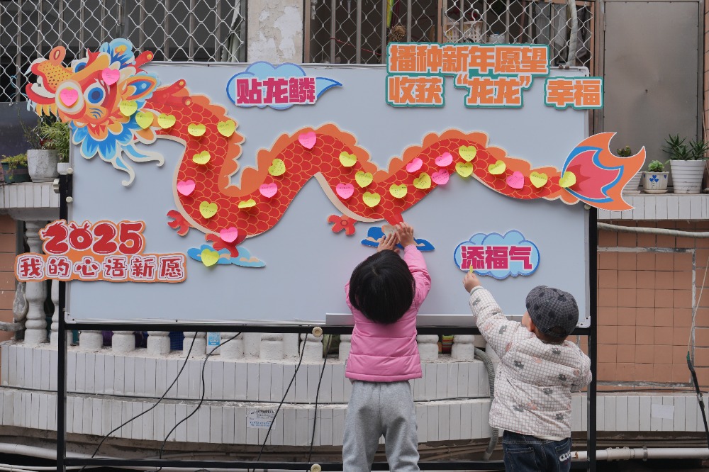 ▲2025年3月1日,在betway88西汉姆联李园一舍“龙抬头送鸿运‘寓见’巧手换新颜”活动现场,两名小朋友在“贴龙鳞”。特约摄影 秦廷富