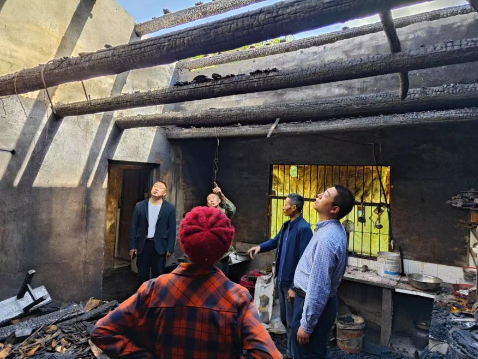 易鹏和村干部正在村民周道芝家中查看火灾受灾情况