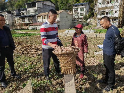 易鹏和驻村干部一道查看村民詹世英家“渝薯198”生产情况,帮助联系企业进行收购。