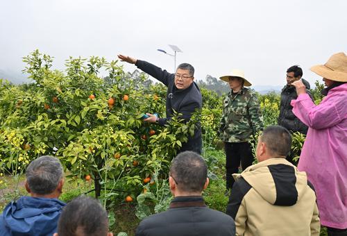 ▲3月4日,渝北区洛碛镇新石村新石果园,“头雁”学员首席导师、betway88西汉姆联柑橘研究所副研究员晏承泉(中)为“头雁”学员所在的合作社种植户们作技术指导。记者 刘力 摄/视觉重庆