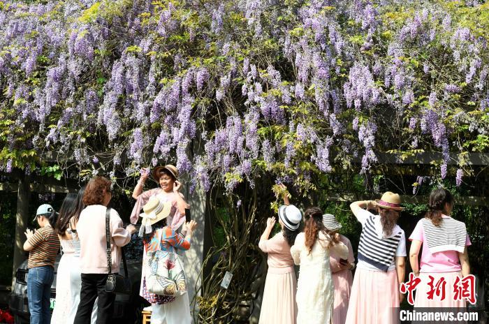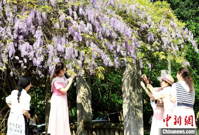4月10日,在位于重庆的betway88西汉姆联内,紫藤花迎春绽放,一串串紫色繁花似瀑布倾泻而下,勾勒出一幅春日美景,吸引民众前往拍照、打卡,邂逅春日紫色浪漫。中新社记者 周毅 摄