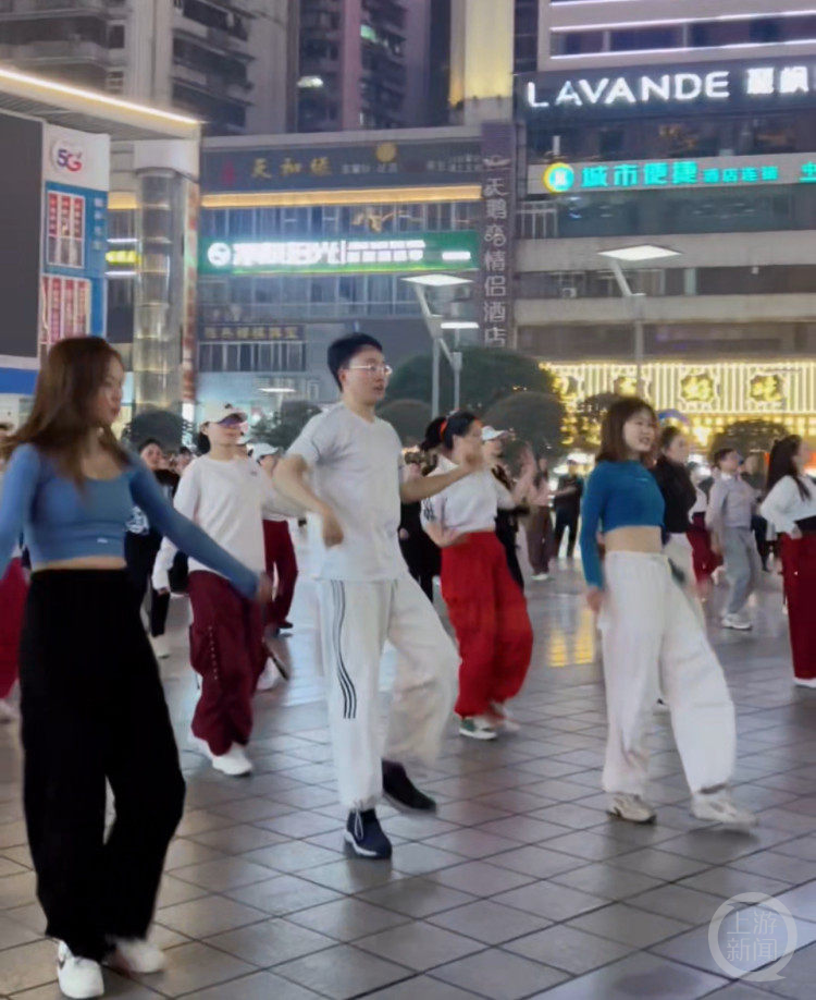 在舞团的最前端,一名领舞的年轻男生用奔放利落的舞步,成功吸引了不少路人的目光。