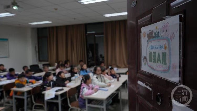 原来,每周六的晚上,这里会有一堂免费的英语课,课堂里排排坐着的也不是大学生,而是喜欢英语的小朋友们。