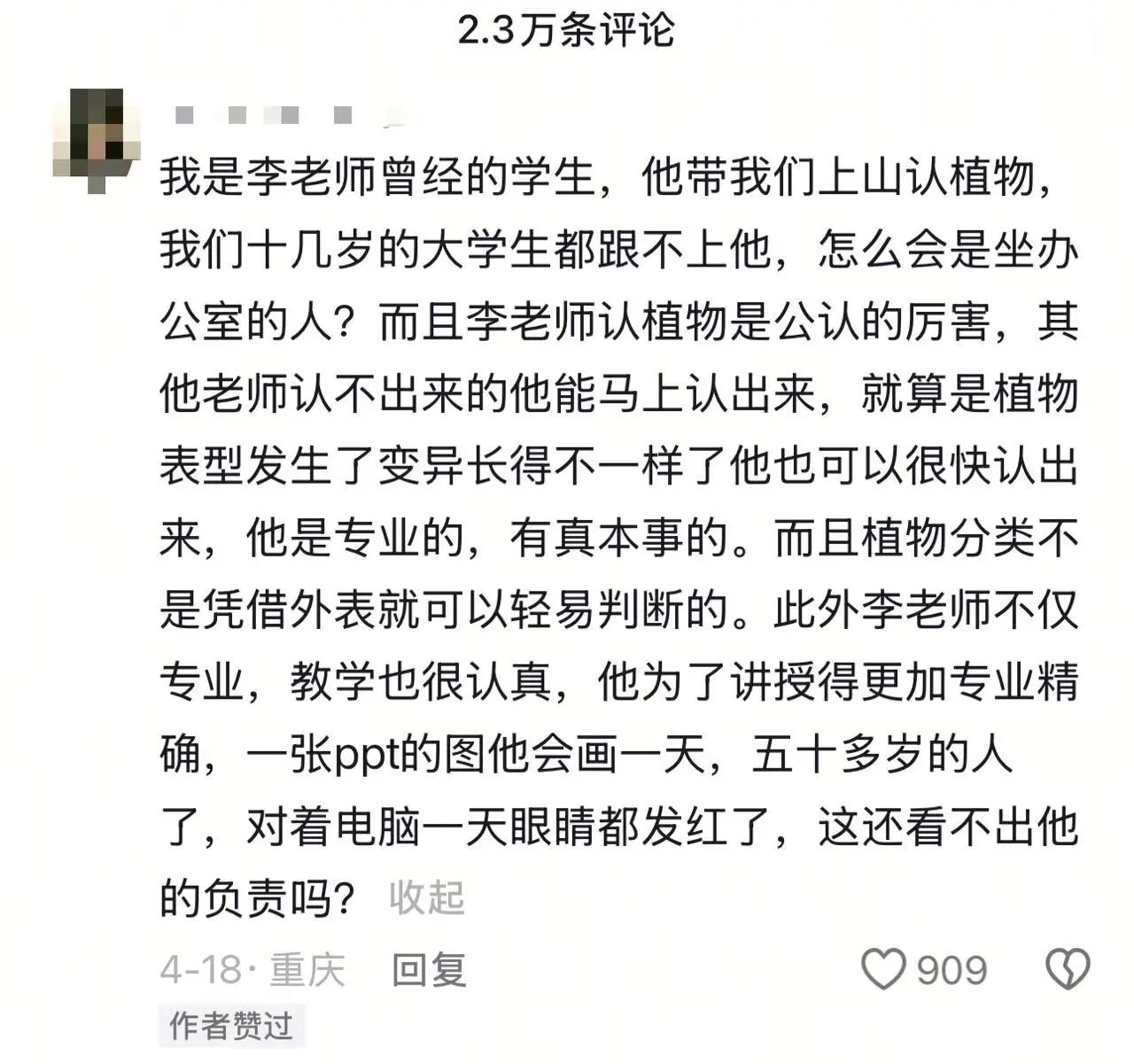 李先源近五年年平均课时940学时,但他已记不清多少次带着学生到缙云山实习,教他们如何识别、采集野外植物。“李老师体力很好,漫山遍野地跑,能跑过他的同学没有几个。”