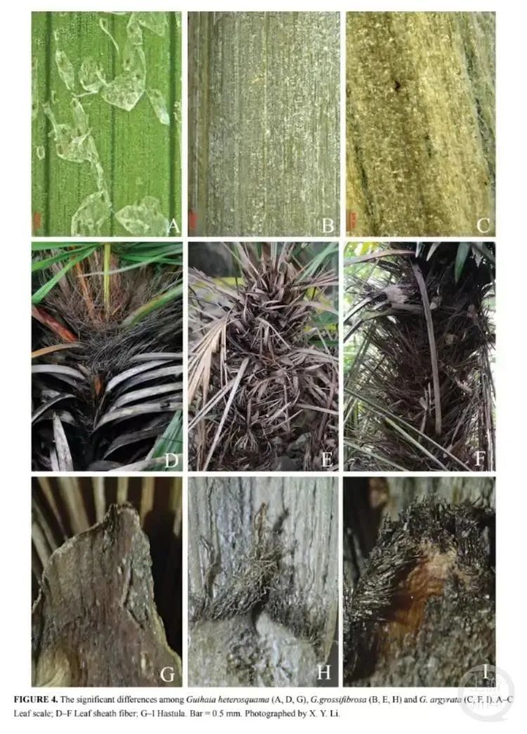 李先源教授表示,为了摸清异鳞石山棕与石山棕、两广石山棕的区别,“光是广西我都去了两次,看它们到底和我们新发现的新种有什么区别,去它们的原产地,结果发现很多不同。一是石山棕的叶鞘纤维老化之后像刺一样扎手,而异鳞石山棕和两广石山棕的叶鞘纤维比较柔软,摸起来像头发一样。两广石山棕的纤维先端是闭合在一起的,而异鳞石山棕纤维的先端是分离的。为什么取名‘异鳞’呢?意思是具有两种不同的鳞片,一种是块状、一种是粉末状。而石山棕的叶背面的鳞片像毛毛一样叠在一起,两广石山棕叶背的鳞片是粉末状的。”