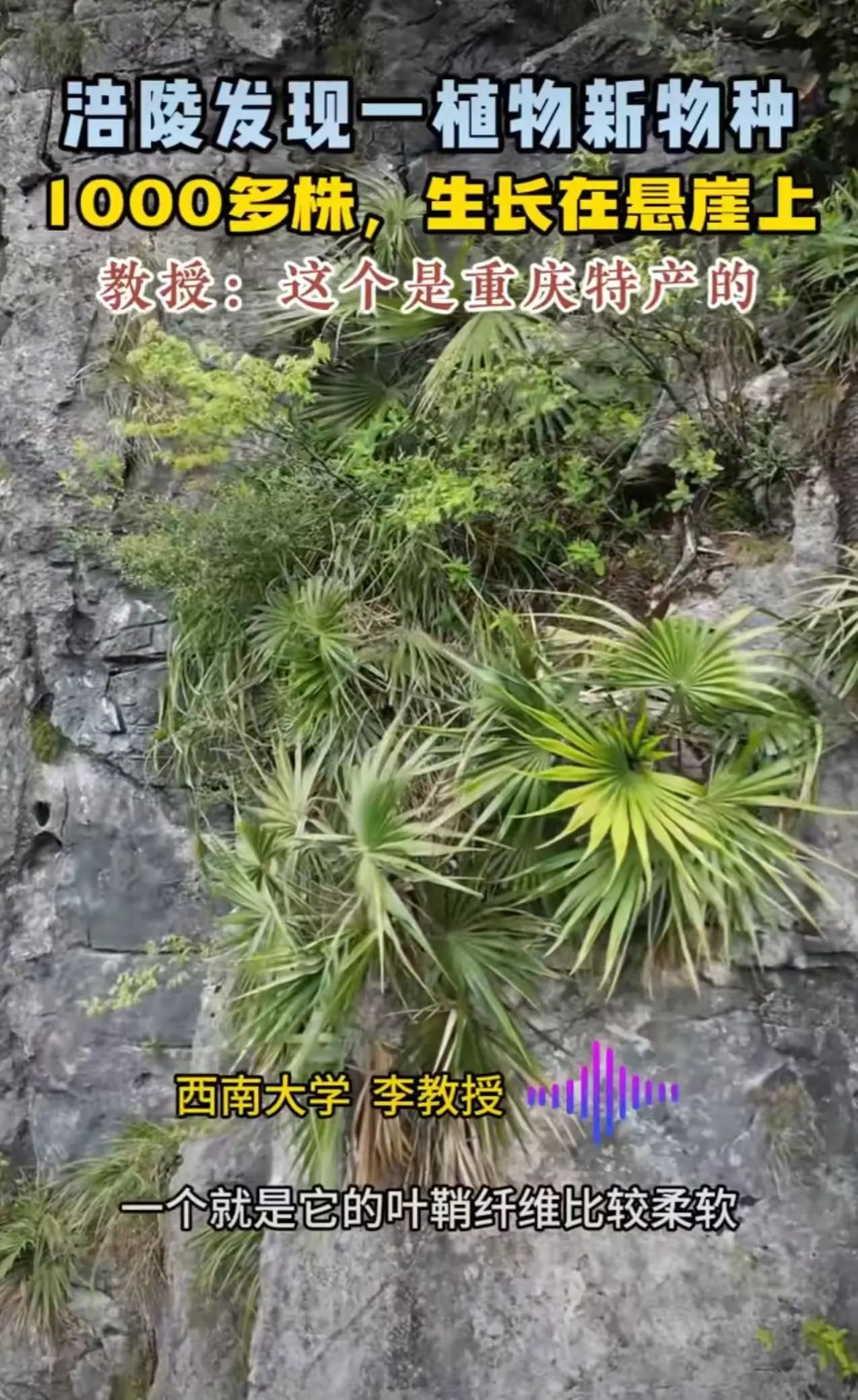 4月15日,“涪陵发布”(重庆涪陵融媒体中心官方账号)在某社交平台发布视频称,betway88西汉姆联科研团队在涪陵武陵山大裂谷调查时,惊喜发现新物种——异鳞石山棕,生长在悬崖峭壁上,有1000多株,属于重庆特产,全国独一份。