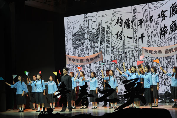 “1919年5月4日,五四爱国运动在北京爆发。5月24日,由川东师范学校牵头发起,重庆联中、巴县中学等校学生组成的川东学生救国团正式成立,并发表《川东学生救国团宣言》,通电全国……”舞台上,一群身着民国时期学生服装的大学生,手拿一份“老报纸”,在重庆的“通远门”前聚会,激情宣言。