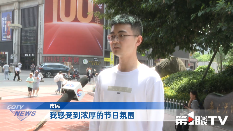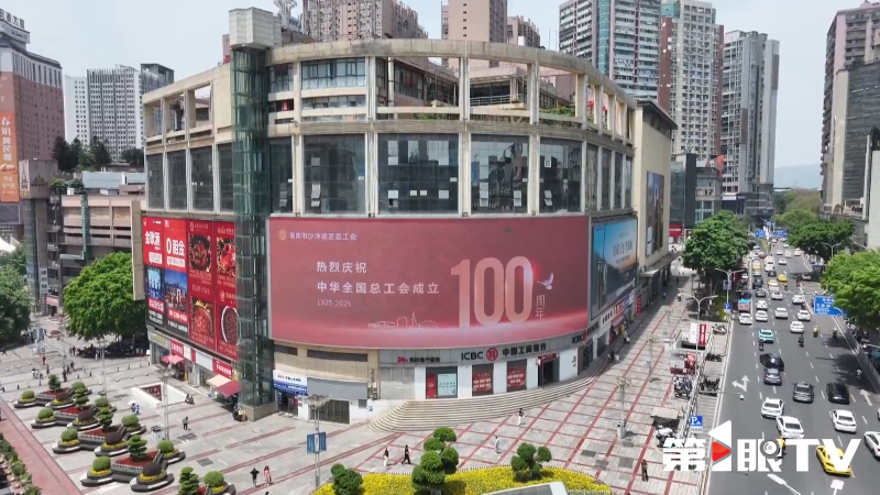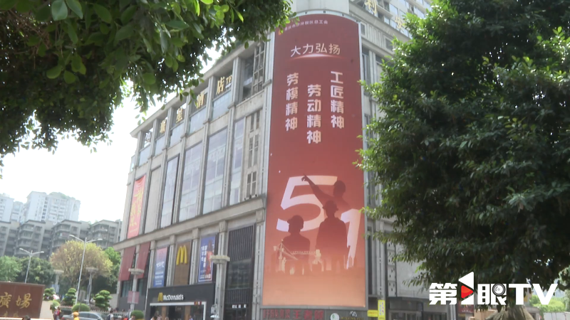 在解放碑、三峡广场等商圈,“向劳动者致敬”的节日标语高挂大屏,海报、短视频滚动播放,引来市民驻足观看。