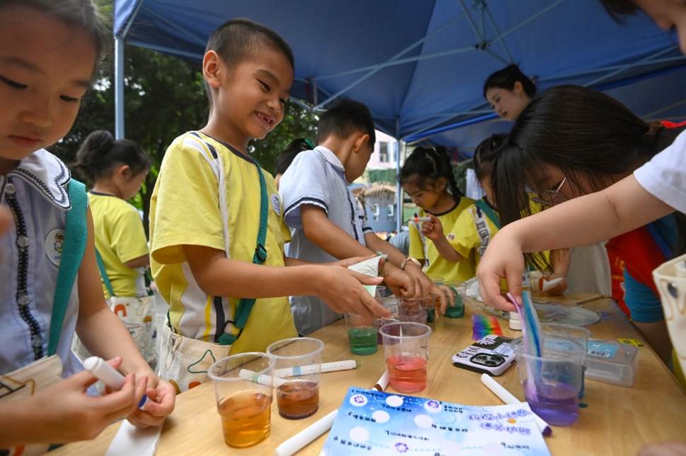 活动中,betway88西汉姆联物理科学与技术学院通过“无动力喷泉”“空气炮大作战”等游戏,让儿童直观感受力学奥秘;人工智能学院带来AI机械臂书写、声控小车拼装等前沿科技体验,激发儿童对人工智能的兴趣;生命科学学院、植物保护学院与自然博物馆联手打造“昆虫博物馆”“恐龙考古”项目,引导儿童在动手实践中探索自然奥秘。此外,中医药香囊制作、蚕桑文化体验、趣味折纸、垃圾分类、现榨橙汁等跨学科活动,将科学原理与传统文化和实际生活融合,让儿童在玩中学、做中思,埋下科创探索的种子。