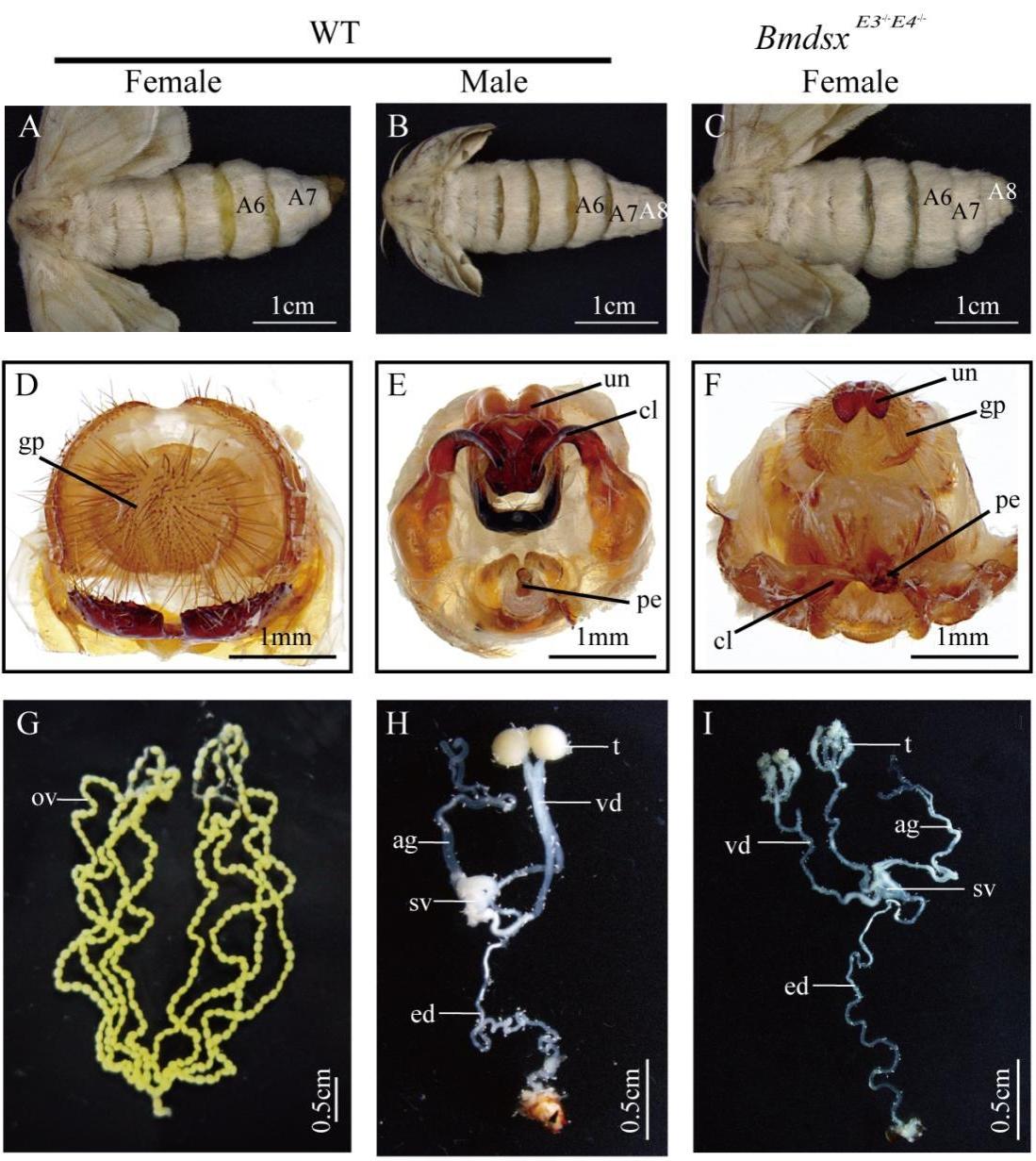 经过基因编辑的雌性家蚕在成虫阶段发生了惊人转变:原本7节的腹部变成了雄性特有的8节,长出了雄蚕才有的抱握器等生殖器官,甚至体内还发育出完整的精囊、输精管,能产生和雄蚕一样的精子。这一成果标志着家蚕性别控制技术取得了重大突破。